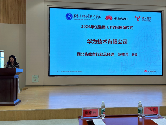 随后,华为技术有限公司湖北省教育行业总经理范林芳发表讲话。她表示:“华为始终致力于推动教育行业的数字化转型和人才培养。与襄阳汽车职业技术学院的合作是我们深耕教育领域、服务地方经济的重要举措。我们相信,通过双方的共同努力,一定能够培养出更多符合市场需求的高素质技术技能人才。”范总还介绍了华为在ICT领域的最新技术成果和人才培养体系,鼓励学院师生积极参与华为认证培训,提升专业技能和竞争力。