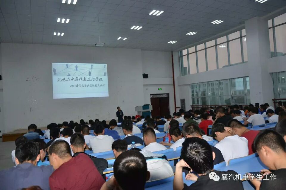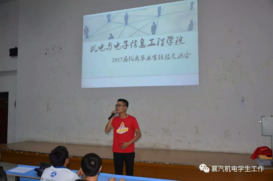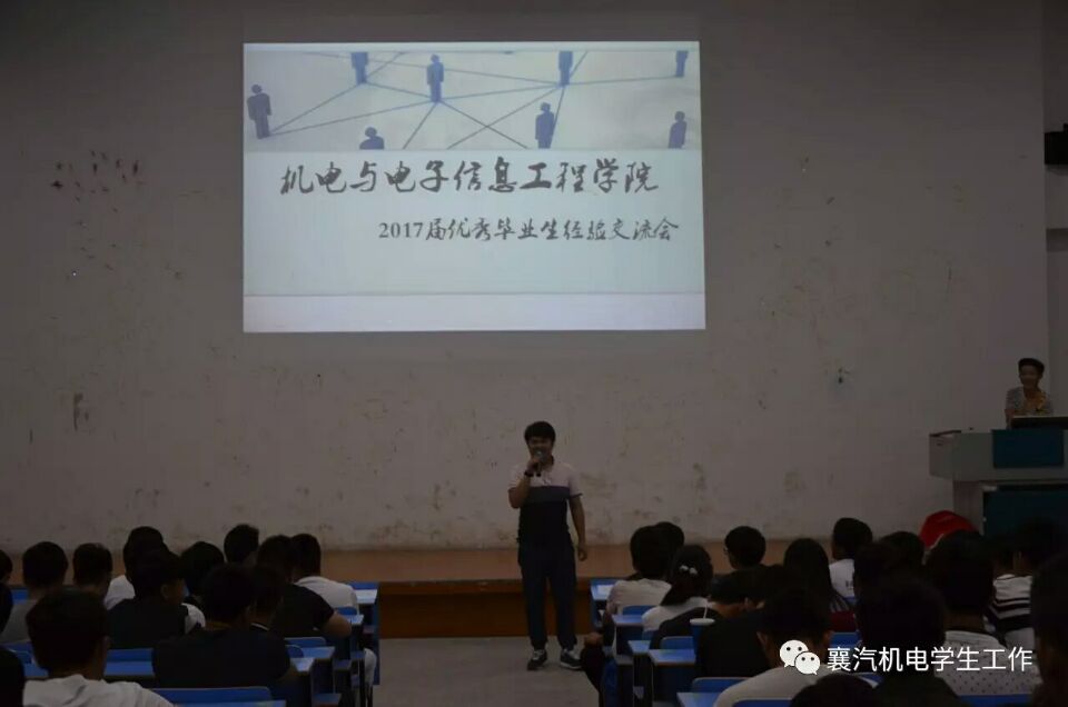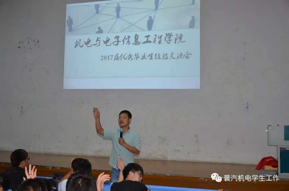 年年岁岁花相似,岁岁年年人不同。又是一年毕业时,为进一步引导广大襄汽学子正确把握在校时光,树立良好的择业观,促进襄汽学子全面发展。2017年5月23日晚,领略今日精英风采,铸就明日机电辉煌——由机电学院主办的优秀毕业生交流会在工程系三楼阶梯教室隆重举行。经过各部门前期紧张的准备和协调,我院的温院长等领导和老师莅临了本次活动,并做出了讲话,以及我院4名优秀毕业生代表以及近300名在校学生出席本次交流会。