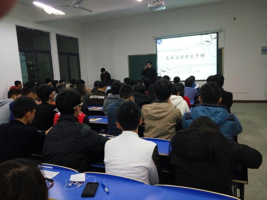 2015年10月9日晚7:00,机电系学生会和团委以及全系辅导员齐聚2A209多媒体教室,机电系团委指导老师张美霞主持本次讲座。机电系主任胡德洪以“怎样当好学生干部”为题进行本次专题讲座,胡主任从高校学生干部的定义、作用、职责和学生干部应具备的素质,学生干部的工作方法及艺术四大方面展开。胡主任关于培养一个好的学生干部,提出来了许多良好的的建议和方法,他提出团学队伍要有团队意识,同时提出了16字方针:计划 、决策、组织、人事、领导、激励、控制、协调;要求系部学生干部要围绕这十六字方针来展开工作,同时也要不断提高自己的工作能力,要正确的认识自己的优缺点!
