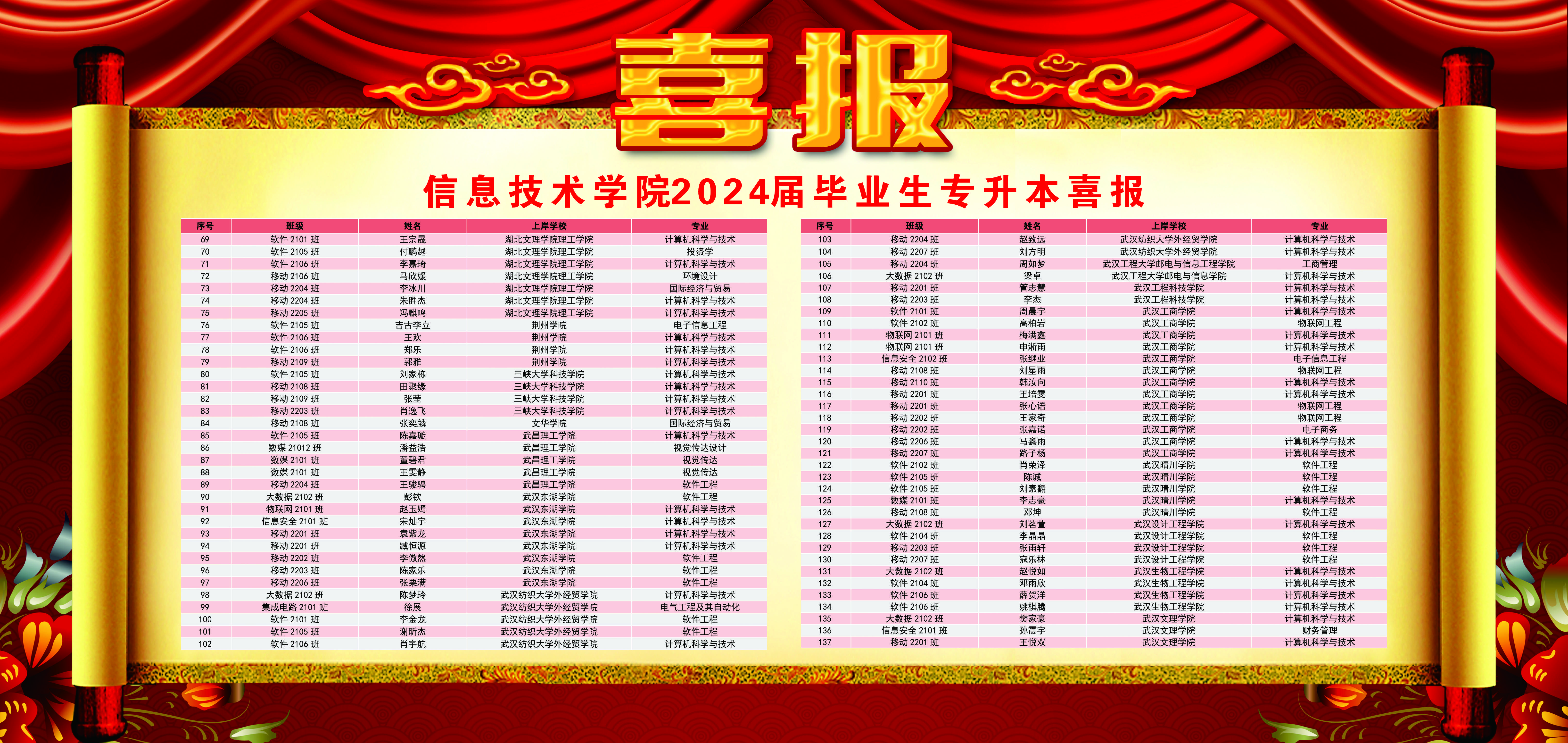 心中耕耘有矢志,硕果飘香又一年。近日,湖北省2024年普通高校专升本录取结果揭晓,我院学生成绩可喜、再创佳绩!今年信息技术学院共有260名学生报考了专升本考试,有141名学生分别被湖北工程学院、湖北第二师范学院、湖北理工学院、湖北汽车工业学院、湖北文理学院、湖北大学知行学院、湖北恩施学院、湖北工程大学邮电与信息工程学院、湖北商贸学院、湖北师范大学文理学院、湖北文理学院理工学院、荆州学院、武昌理工学院、武汉工商学院等省内31所本科院校录取,录取率达54%。