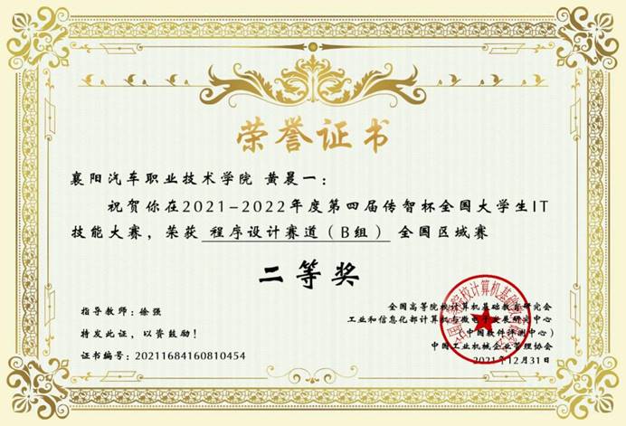 本次大赛共吸引来自全国800多所高校10万余名学生参加。我院相关专业130名同学参加了本次比赛。近日,该赛事公布了比赛结果,襄阳汽车职业技术学院大数据技术专业的黄晨一、晋玉龙等4名同学喜获二等奖。