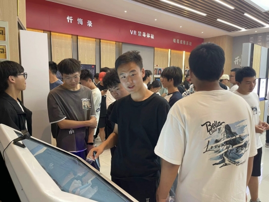 在三十五中副校长王奇君的带领下,同学们依次参观了禁毒教育基地的毒情形势区、毒品危害区、涉毒场景“VR”模拟区、互动体验区、毒品预防教育区等展区,以及展区外各宣传栏板块。