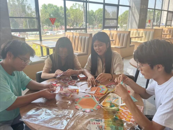 一幅幅精美的绘画作品,以淡蓝色和金黄色为主色调,营造出了温馨的节日氛围。展位的一侧,悬挂着各式各样的灯谜,同学们三五成群的聚集在此,时而蹙眉思考,时而恍然大悟后露出开心的笑容,领取一份属于他们的小奖品。互动区更是热闹非凡,在学长的指导下,一张张碎片拼接为精美的小灯笼。学校的领导老师们也纷纷来到了展位,对同学们的创意赞不绝口,纷纷送上佳节祝语。