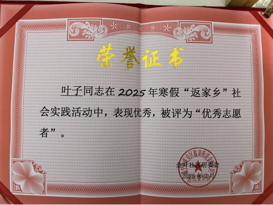 在本次实践结束后我荣获了当地团工委颁发的“优秀志愿者”证书。收到这份返家乡证书,往昔在法律服务所的日子如潮水般涌上心头。初来乍到,面对堆积如山的卷宗,满心都是迷茫与无措。但在前辈们耐心指导下,我逐渐熟悉流程,从整理文件时对法律条文的初步认知,到协助调解纠纷时亲身体会法律在生活中的运用,每一步都走得坚实且充满收获。